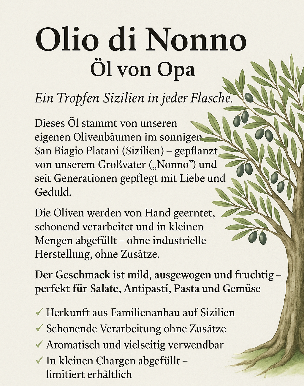 Unser Olivenöl stammt von den Bäumen unseres Opas, die seit Jahrzehnten in der sizilianischen Sonne wachsen. Es ist das Herzstück unserer Küche – ehrlich, pur, mit Liebe gemacht. Und genau so soll sich auch dein Besuch bei uns anfühlen: echt, warm, voller Geschmack und Seele.